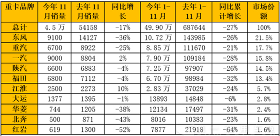 累 計來看,1-11月,重卡市場累計銷售49.9萬輛,同比下滑27%,雖然降幅有一點點的縮窄,但仍在-25%以上。東風仍然是老大,1-11月累計銷售 重卡10.72萬輛,同比下降26%,跟行業平均水平相當,市場份額為21.5%;中國重汽累計銷車8.85萬輛,同比下降21%,低于行業整體降幅,市 場份額升至17.7%;第三名為一汽集團,累計銷售重卡7.9萬輛,同比下滑28%,降幅也接近行業平均水平,市場份額為15.8%。