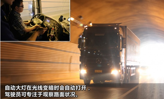 在此次試駕在北京西六環(huán)的時(shí)候經(jīng)過幾個(gè)短暫的隧道,當(dāng)Actros前風(fēng)擋玻璃后的光線傳感器探測(cè)到光線變暗之后自動(dòng)將大燈打開,在黑暗的環(huán)境中,燈光會(huì)提醒對(duì)面車輛的駕駛員,避免出現(xiàn)交通事故。同時(shí),駕駛員遇到隧道這樣光線突然變化的環(huán)境,就可以集中精力去觀察道路情況了,而不需要再去調(diào)節(jié)大燈。對(duì)于大燈的具體使用在歐洲都有明確的要求,國(guó)內(nèi)還沒有特別的法規(guī)要求。另外,光線傳感器同時(shí)實(shí)現(xiàn)了自動(dòng)雨刷可以根據(jù)雨量大小自動(dòng)控制雨刷速度的功能。此次試駕正好遇上大暴雨,在自動(dòng)雨刷的輔助下,老牛可以將更多精力集中在觀察路況,保證安全上。這些小的細(xì)節(jié)不僅更加方便,同時(shí)也提高了車輛的安全性。