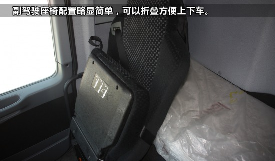 相比主駕駛座椅的豪華,副駕駛的配置則顯得比較簡(jiǎn)單,座椅可以抬起,方便人員上下。這也與歐洲卡車的使用情況有關(guān),歐洲卡車很多都是只有一個(gè)駕駛員,副駕駛使用的情況并不是很多。