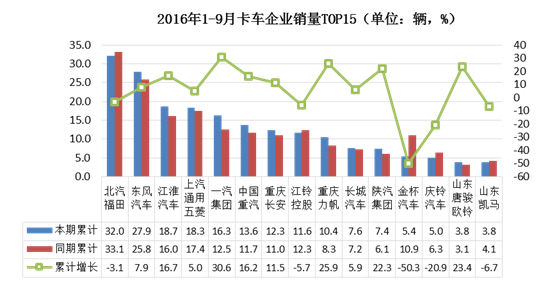 1-9月,前十五企業銷量排名中,北汽福田位居第一名,銷售32.0萬輛,同比下降3.1%;其中,金杯汽車銷量下滑較大,同比下降50.3%。