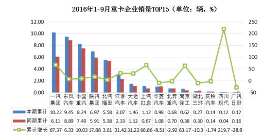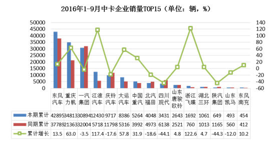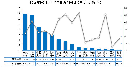 2016年1-9月中重卡企業中,東風汽車銷量排名第一,累計銷量達到13.74萬輛,同比增長8.47%;銷量前十五企業中,重慶力帆、上汽紅巖和南京徐工銷量增長較大,增幅均超過60%。