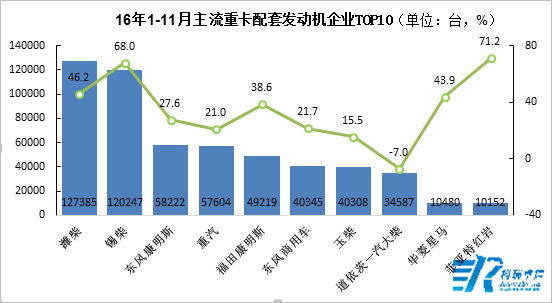 重卡配套動力方面,從2016年1-11月份配套信息來看,配套前三的發(fā)動機企業(yè)分別是濰柴、錫柴和東風(fēng)康明斯,累計配套量分別為12.74萬輛、12.02萬輛和5.82萬輛,同比增幅分別為46.2%、68%和27.6%。重卡配套前十的發(fā)動機企業(yè)中,錫柴和菲亞特紅巖同比增幅超過65%,增幅較大;道依茨一汽大柴同比下降7.0%,降幅最大。